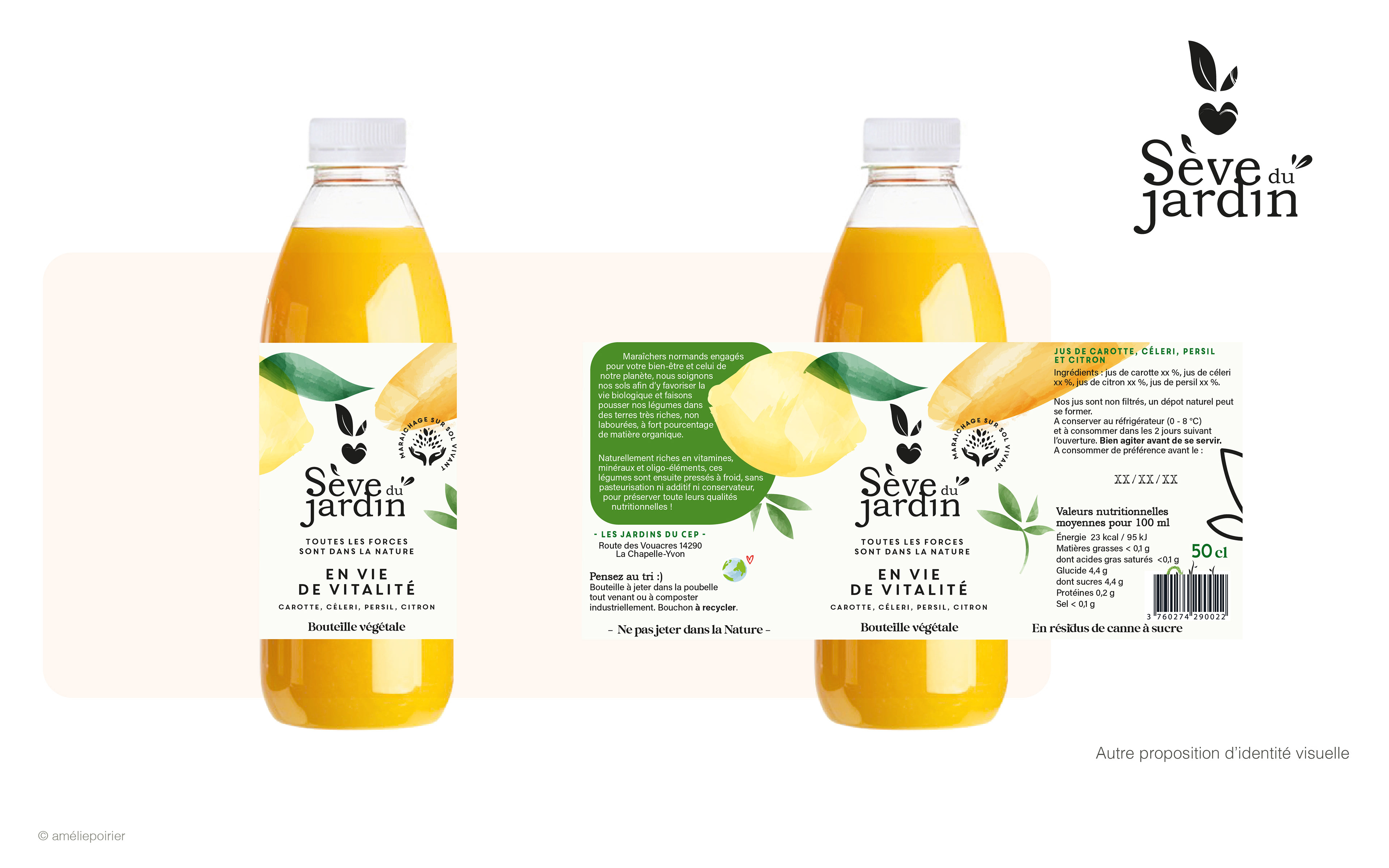 Création de l’identité visuelle d’une gamme de jus légumes et fruits de saison.